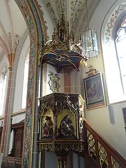 • Die 1912 hergestellte neugotische Kanzel wurde rechts des Chorbogens anstelle des rechten Seitenaltares angebracht. Der Korpus wird von den geschnitzten Halbreliefs der vier Evangelisten geschmückt und wird überdacht von einem reich verzierten Schalldeckel.[5]