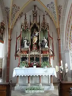 • Der Hochaltar wurde 1867 vom ortsansässigen Schreiner Johann Alezee gefertigt. Die Mensa ruht auf vier schwarzen Marmorsäulen. Darauf befindet sich der von zwei Anbetungsengeln flankierte Tabernakel. In der Predellazone sind im Halbrelief gefertigte Büsten der vier Kirchenväter Ambrosius, Hieronymus, Augustinus und Gregors des Großen zu sehen. An zentraler Stelle befindet sich eine vom Vilsbiburger Maler Balthasar Clauser gefasste Figurengruppe der Taufe Jesu durch Johannes den Täufer. Die Darstellung wird flankiert von den hll. Diakonen Stephanus (links) und Laurentius (rechts). Im Altarauszug ist eine Figurengruppe, bestehend aus Gott Vater und zwei stehenden Engeln, zu sehen.[5]