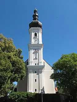 Auf der Westseite ist ein Spindelhelmturm mit Laterne angebaut, der ein typisches Merkmal der Barockkirchen im Erdinger Land ist. Der dreigeschossige Turm über quadratischem Grundriss wird durch Pilaster und Lisenen an den Kanten gegliedert und besitzt weit auskragendes, profiliertes Gebälk als Geschosstrennung. Das obere Geschoss, welches Glockenstuhl, Schallöffnungen und Turmuhr enthält, besitzt abgeschrägte Ecken. Auf der Südseite des Chores ist die zweigeschossige Sakristei angebaut.