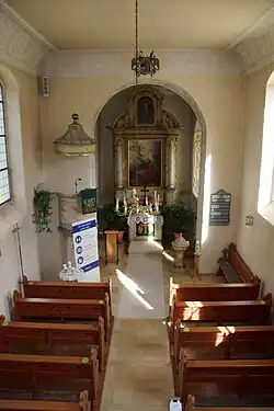 Die Deckenmalerei der Flachdecke, mit der der Innenraum überspannt ist, wurde um 1777 geschaffen. Im Westen befindet sich eine Empore, auf der die von Erich Bauer[3] gebaute Orgel mit elf Registern, zwei Manualen und einem Pedal steht. Der Altar wurde 1719, die Kanzel 1780 gebaut.