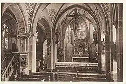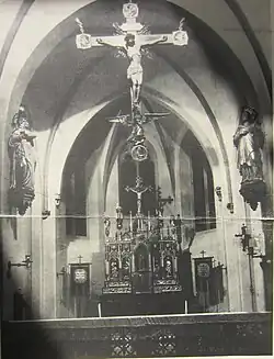 Der Korpus des im Chorbogen über dem Altar positionierten Kruzifixes stammt aus der 1. Hälfte des 15. Jahrhunderts. Die Figuren an den Chorpfeilern zeigen links den hl. Johannes Baptist und rechts die hl. Katharina. Beide Figuren gehören zur neugotischen Ausstattung und blieben erhalten. Die Figuren der hl. Maria und des hl. Johannes (Apostel) wurden zum Ende der 1950er Jahre aus der Kirche entfernt, ebenso das vorherige Kruzifix samt Korpus (Mitte 16. Jh.). Diese Figuren sowie der Korpus hängen heute als Gruppierung in der Seitenkapelle der Nebenkirche St. Paulus. Der Korpus wurde dort auf dem restaurierten Kreuzesbalken aus dem Jahre 1904 befestigt.[5]