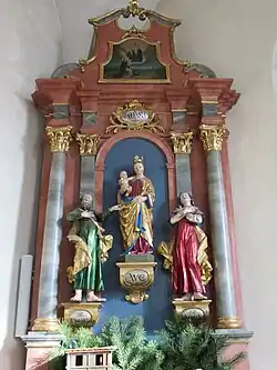 Die beiden Seitenaltäre stammen aus der Barockzeit. Der linke Seitenaltar ist der heiligen Maria gewidmet. In ihm steht die 97 cm hohe spätgotische (ca. Ende des 15. Jahrhunderts) Figur der heiligen Maria mit Holzkrone und Kind auf dem Arm. Sie wird gesäumt von ihren Eltern St. Joachim und St. Anna. Über der Marienfigur ist ein Gemälde (um 1900) mit dem heiligen Dominikus, der vor einer weiten Landschaft und Maria mit dem Kind in der Himmelsöffnung kniet.[1]