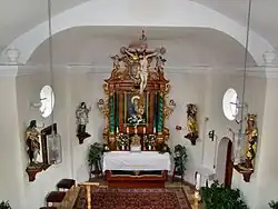 Das flache Tonnengewölbe des Langhauses ist mit Pilastern gegliedert. An der Süd- und Nordseite befinden sich jeweils zwei große Rundbogenfenster. Über dem Eingangsbereich an der Westseite ist eine stark vorgeschwungene Empore auf Holzstützen eingebaut. Der Altarraum hat ebenfalls eine Pilastergliederung. Er wird durch zwei kleine kreisrunde Fenster beleuchtet.[1] Die Kapelle wurde bisher dreimal renoviert (1887/88, 1955/56 und 1994/95).