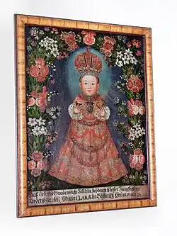 Es ist 100 Zentimeter hoch und 77 Zentimeter breit und dürfte zur Zeit des Barocks geschaffen worden sein, was aus der das Jesuskindlein umgebenden Blumenumrandung hervorgehen könnte. Die Hauptmotive dieses Blumenkranzes sind symmetrisch angeordnete Rosen und Dichternarzissen, Maiglöckchen und Kornblumen. Im unteren Teil des Bildes befindet sich anstatt des Blumenkranzes die Inschrift „Daß Lieb: und Gnadenreiche Jesuleiin bey denen Closter Jungfrauen Ordenß der Heil Mutter CLARAE in Böhmisch Crummau.“ Die Jesuskindfigur ist das zentrale Thema des Bildes. Sie ist mit einem fröhlichen Kindergesicht mit abstehenden Ohren, braunen Augen und einem kleinen lächelnden Mund dargestellt und trägt eine mit Edelsteinen geschmückte übergroße Königskrone mit einem Reichsapfel. Das Kleid des Kindes ist rot mit reichen Verzierungen und mit einem Rosenkranz und einem Kruzifix versehen. Das Kind hält in der rechten Hand eine Rose, in der linken ein flammendes Herz. An jedem Finger trägt es einen Ring.[5]