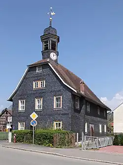 Die erste Kirche wurde 1634 zerstört. Die 1681/82 gebaute Saalkirche ist eine verschieferte Fachwerkkirche, die wie ein zweigeschossiges Wohnhaus aussieht. Sie trägt ein Krüppelwalmdach, aus dem ein sechsseitiger Dachreiter mit Haube ragt. Der Innenraum mit seiner eingeschossigen Empore wird von einer profilierten Holzbalkendecke überspannt. Der polygonale Korb der Kanzel in der südöstlichen Ecke, gemäß Inschrift von 1684, hat gedrehte Säulen. In den Feldern seiner Brüstungen stehen in den muschelförmige Nischen die Evangelisten sowie Petrus und Christus. Auch der Taufengel stammt von 1684. Die barocke Orgel über dem Altar auf der Ostempore wurde 1770 von Johann Ernst Döring gebaut.[2]