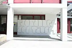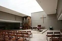Über eine Treppe gelangt man von der tiefer gelegenen Huebwiesenstrasse auf den in den 1970er Jahren neu geschaffenen Gemeindeplatz, um den sich die Ämter der politischen Gemeinde, die Post, ein Hotel, ein Hallenbad, eine Bank sowie verschiedene Einkaufsmöglichkeiten gruppieren. Inmitten dieses Zentrums befindet sich die katholische Kirche St. Johannes. Dass es sich bei diesem schlichten Betonbau um ein kirchliches Zentrum handelt, ist nicht offensichtlich, da die Kirche optisch an die anderen Bauten um den Dorfplatz angeglichen worden war. Ein Dachreiter, in dem sich die drei Glocken der Kirche St. Johannes befinden und an den eine Turmuhr sowie ein schlichtes Metallkreuz angebracht wurden, verweist auf die kirchliche Nutzung des Gebäudes. Das dreistimmige Geläut wurde von Emil Eschmann, Rickenbach TG im Jahr 1972 gegossen und erklingt in der Tonfolge fis, a, h. Neben dem Eingang befindet sich an der Betonwand eine reliefartige Inschrift: „Johannes der Täufer“. Durch ein Foyer gelangt der Besucher in die eigentliche Kirche St. Johannes.