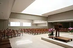 Der Kirchenraum ist ein längsrechteckiger Betonbau, dessen hinterer Raumteil durch eine im Boden eingelassene Trennwand bei kleineren Gottesdiensten abgeteilt werden kann. Der Boden ist aus hellem Stein, die Wände in grau gestrichenem Beton und die Kirchendecke in hellen Materialien gehalten. Holzstühle gruppieren sich in einem Halbkreis um den durch eine Stufe erhöhten Altarraum, welcher nicht geostet ist, sondern in südöstliche Richtung zeigt. Das Tageslicht dringt durch ein lang gezogenes, längsmittiges Oberlicht in den Raum. Dieses Oberlicht befindet sich im erhöhten Teil des Raumes, sodass der Eindruck einer dreischiffigen Kirche entsteht. Der Volksaltar und der Ambo sind aus Holz und stellen damit einen Bezug zu den Holzstühlen der Gemeinde her, was den Communio-Charakter dieser in nachvatikanischer Zeit errichteten Kirche unterstreicht. Hinter dem Altarraum ist ein schlichtes Holzkreuz an der Betonwand angebracht. Rechts vom Altarraum befindet sich an der Chorwand der Tabernakel. Er ragt mittels einer Betonstruktur, welche die quadratischen Formen sowie die abgerundeten Ecken der Raumarchitektur aufnimmt, aus der Wand hervor. Im beleuchteten Inneren des Tabernakels ist das Ziborium als Zeichen der Realpräsenz Gottes sichtbar. Auf der linken Seite des Altarraums steht die Orgel. Im linken Teil des Kirchenraumes ist in die Seitenwand ein kleineres, blau gehaltenes Buntglasfenster eingelassen. Kunsthistorisch bedeutsam ist die St. Johannes-Statue an der gegenüberliegenden Seitenwand der Kirche. Diese mittelalterliche St. Johannes-Statue stammt aus der Kirche von Würenlos, zu der bis zu Beginn des 19. Jahrhunderts auch Unter-Oetwil gehört hatte. Die Kirchenstiftung von Geroldswil vereinbarte mit der Kirchgemeinde Würenlos im Jahr 2010, dass die Statue auf unbestimmte Zeit in der Kirche St. Johannes in Geroldswil aufgestellt werden kann.[9]