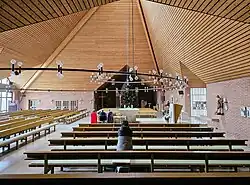 An der künstlerischen Ausgestaltung der Kirche war Elisabeth T. Veith beteiligt. Der Altar wurde passend zur Architektur gestaltet. Der Altarstein aus der Vorgängerkirche, eine 35 mal 35 Zentimeter große Marmorplatte, wurde 2005 nach St. Johannes überführt. Eine Johannesstatue und ein Holzkreuz waren schon zuvor übernommen worden.[1] Die große Johannesskulptur aus Beton auf dem Vorplatz stammt vom Bildhauer Leo Janischowsky. Sie war eine Stiftung des Bauunternehmens, das den Gebäudekomplex erstellt hatte.