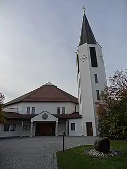 Der Kirchenbau liegt etwas zurückgesetzt von der vorbeiführenden Alten Regensburger Straße. Der linke Flügel, der sich – an den Gottesdienstraum anschließend – Richtung Osten, also Richtung Straße zieht, enthält Sakristei und Pfarrheim. Er erhält eine Art „Gegengewicht“ durch den rechten Flügel, der ein Beichtzimmer und den 33 Meter hohen, achteckigen Campanile mit Spitzhelm umfasst. Die Tatsache, dass der rechte Flügel deutlich kürzer ausfällt, stört nicht den Eindruck, dass der Kirchenbesucher von dem Baukomplex „mit offnen Armen empfangen“ wird. Entlang von Pfarrheim, Sakristei und Kirche zieht sich ein niedriges Vordach, wobei das Kirchenportal durch eine Ädikula hervorgehoben ist – eine Anspielung auf die Fassadengestaltung der Pfarrkirche St. Konrad. Im Dreiecksgiebel der Ädikula ist ein Betontondo zu sehen, das eine Darstellung der Taufe Jesu enthält und somit auf das Kirchenpatrozinium verweist. Es wurde von der Bildhauerin Christine Stadler geschaffen und befindet sich in identischer Form auch im Pfortenhof von Kloster Andechs.[3]