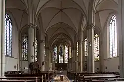 Das Innere der dreischiffigen Hallenkirche wird durch Bündelpfeiler gegliedert, deren Dienste in Kelchknospenkapitellen enden. Die Decke bildet ein spitzbogiges Kreuzrippengewölbe.