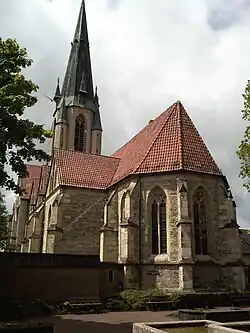 * Der neugotische Hochaltar wurde 1883 nach dem Vorbild gotischer Flügelretabel gebaut. Der geschnitzte Schrein ist der Langenberg-Werkstatt zugeschrieben. Die Flügel wurden von Albinus Windhausen bemalt.