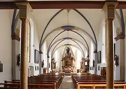 Der marmorne Taufstein ist ein Werk aus der Zeit um 1700. Die Kanzel aus Holz ist auf 1709 datiert. Ein Ölgemälde aus dem 17. Jahrhundert stellt die Heilige Familie mit Anna und Josephs Tod dar, zwei weitere die heilige Katharina (1702) und die heilige Apollonia (1710). Der Kreuzweg mit Ölbildern und Inschriften wurde 1775 von Stanislaus Stegmüller geschaffen. Mehrere hölzerne Figuren zeigen eine Doppelmadonna, die Immaculata und den heiligen Johannes Baptist (18. Jahrhundert) sowie die Unterweisung Mariens, den heiligen Johanns Nepomuk und die heilige Barbara (20. Jahrhundert).[1] Ein silbervergoldeter Kelch mit Edelsteinen und Emailmedaillons wurde im 18. Jahrhundert gearbeitet.