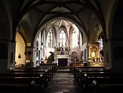 Die katholische Pfarrkirche wurde um 1230 als flachgedeckte romanische Basilika gebaut. Um 1500 wurde sie zu einer gotischen Hallenkirche mit Netzgewölben erweitert und mit einem hohen Chor versehen. Von der romanischen Ursprungskirche sind noch die Langhauswände und der Turm erhalten.