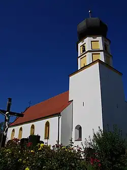Die Saalkirche wurde unter Verwendung des romanischen, quadratischen Chorturms im 17./18. Jahrhundert erbaut. Das Langhaus wurde 1903 nach Westen verlängert. Der Chorturm wurde mit zwei achteckigen Geschossen aufgestockt und mit einer Zwiebelhaube bedeckt. Der Innenraum des Langhauses ist mit einer Flachdecke überspannt, der des Chors, d. h. das Erdgeschoss des Chorturms, mit einem Kreuzgewölbe. Zur Kirchenausstattung gehört ein Hochaltar mit seitlichen Akanthusranken vom Anfang des 18. Jahrhunderts. Die Seitenaltäre sind mit Statuen bestückt, die links den heiligen Josef und rechts die heilige Anna selbdritt darstellen. Eine Prozessionsstange mit der Statuette des heiligen Sebastian stammt aus dem 15./16. Jahrhundert.