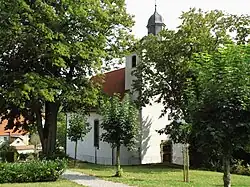 Die Pfarrei existiert seit dem 13. Jahrhundert. Die Saalkirche mit geschwungenem Chorschluss wurde von 1746 bis 1747 aus verputztem Bruchstein errichtet. Der schmale Westturm ist quer vorgelagert. Im Innenraum befinden sich zwischen den Fenstern wandpfeilerartige Sockel für Figuren. Im Chor sind es schmale, spitze Vorlagen.