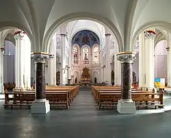 In der Kirche befinden sich sieben Altäre: der Hochaltar von 1893, der Marienaltar von 1894, Johannesaltar von 1894, der Barbara-Altar, der Herz-Jesu-Altar sowie der Zelebrationsaltar. Im Rahmen der letzten Innenrenovierung wurde im Chorraum zwischen Zelebrations- und Hochaltar eine Werktagskirche mit einem eigenen kleinen Altar eingerichtet.