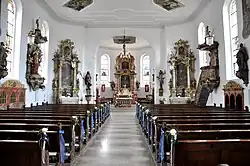 Zur Kirchenausstattung gehört ein Hochaltar, der aus dem Kloster Weißenau stammt. Zur Zeit des Rokoko wurde eine Kanzel aufgestellt. Die Orgel wurde 1998 von Eduard Wiedenmann gebaut.[1]