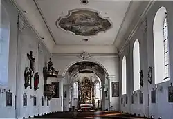 Der Innenraum des Langhauses ist mit einer Flachdecke überspannt, ebenso das Querschiff. Die Decke über der Vierung ist als flache Kuppel ausgebildet. Der Hochaltar wird von den Skulpturen des Ulrich von Augsburg und des Augustinus von Hippo flankiert.