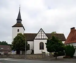 Die Kreuzkirche aus verputzten Bruchsteinen wurde im Kern im 17. Jahrhundert erbaut. Das Langhaus wurde bereits 1605 gebaut. Es wurde 1609 nach Osten mit einem Chor verlängert und mit einem gemeinsamen Satteldach bedeckt. Das Querschiff wurde erst 1668 eingefügt. Der Kirchturm im Westen entstand erst 1740. Eine Treppe außen an der Westseite vom südlichen Querarm führt zur Patronatsloge.