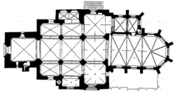 Der kreuzförmige Grundriss folgt noch dem romanischen Schema einer Basilika. Einem dreischiffigen Langhaus ist eine quadratische Turmhalle im Westen vorgelagert. Die Seitenschiffe sind in den ersten beiden Jochen nur halb so breit wie das Hauptschiff. Im dritten Joch weitet es sich querschiffartig mit drei quadratischen Jochen aus. Offenbar hat es jedoch dann während der Bauphase eine Planänderung hin zur Hallenkirche gegeben, denn die Seitenschiffe bekamen fast die gleiche Höhe wie das Mittelschiff und die Pfeiler wurden als Bündelpfeiler – etwas schlichter im Westen und mehrteiliger im Osten – ausgebildet. Die Quer- und Längsgurte sind spitzbogig geschlossen, Gewölberippen fehlen. Während die Architekturelemente aus rötlichem Wesersandstein gearbeitet sind, sind die Flächen innen verputzt und außen in Kalkbruchstein gearbeitet. Wahrscheinlich hatte die Kirche ursprünglich einen östlichen Abschluss durch einen rechteckigen Chor in der Höhe des Mittelschiffes.