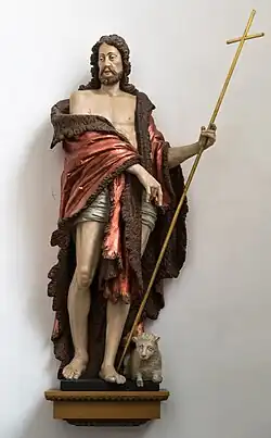 - Barocke Figurengruppe in der rechten Seitenkapelle mit Jesus und Johannes dem Täufer aus dem ehemaligen von Johann Conrad Schlaun entworfenen Hochaltar von 1719
