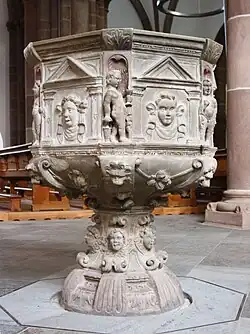 - Renaissancekanzel von 1611 mit figürlichen Darstellungen Johannes des Täufers, der Evangelisten und der vier Kirchenväter
