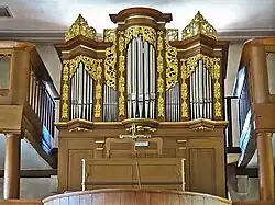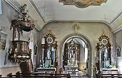 Im Jahr 1780 erhielt die Kirche eine Kanzel von Simon Wagner mit der Darstellung der Erdteile auf dem Korpus als Büsten.[9] Putten mit den Attributen des Papsttums bekrönen den kunstvollen Schalldeckel, ein Relief des auferstandenen Christus verbindet beide Teile. Die reichen Verzierungen weisen auf den barocken Inszenierungsgedanken hin.