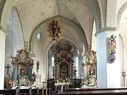 Die beiden Seitenaltäre und die Beichtstühle sind Werke des Bildhauers Leonard Falter aus dem Jahr 1775. Der linke Seitenaltar ist der Heiligen Maria gewidmet. Er hatte einen Vorgängeraltar, der bereits 1451 erwähnt wurde. Auf seitlichen Konsolen stehen links und rechts die Heiligen Apollonia und Barbara. Der rechte Seitenaltar ist dem Heiligen Nikolaus geweiht. Er hatte ebenfalls einen Vorgängeraltar, der 1627 nachweisbar ist. An seiner linken und rechten Seite stehen Figuren der Heiligen Laurentius und Vinzenz. Ein weiterer Altar, zu Ehren des letztgenannten Heiligen errichtet, wird um 1730 erwähnt, besteht aber heute nicht mehr. 1775 wurden die drei beschädigten Altäre der Maria, des Nikolaus und des Vinzenz erneuert und danach neu geweiht.[1]