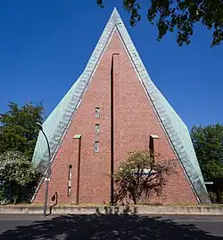 Das Gebäude ist eine sehr klare Umsetzung der architektonischen Idee vom „Zelt Gottes“ (Offb 21,3 ): Das mit grün patiniertem Kupferblech eingedeckte Dach[4] reicht nach Art eines Nurdachhauses bis zum Boden, der Bau hat keine vertikalen Wände. An den Giebelseiten aus Ziegel-Mauerwerk treten innen und außen an der Chorseite drei senkrechte Mauerstreifen hervor, die die Wand strukturieren. Am gegenüberliegenden, hell verglasten Giebel führt eine zylindrisch gemauerte Treppe zu Empore und Glockenstube, die leicht aus dem Giebel hervortreten und mit Holz verkleidet sind.