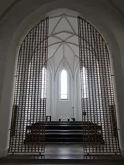 Als Übergang zum Neubau dienen drei spitzbogige Öffnungen an der Nordwand der gotischen Kirche. Von dort erstreckt sich nach Norden ein 22 Meter langer und 16,5 Meter breiter, moderner Kirchenraum. Typisch für den Architekten Haindl ist der Charakter vom „Zelt Gottes unter den Menschen“. Der aus Beton errichtete Erweiterungsbau besitzt in Richtung Osten und Westen je zwei hoch angesetzte, spitze Fensteröffnungen, die an gotische Spitzbogenfenster erinnern sollen. Auf der nördlichen Stirnseite, wo sich der um vier Stufen erhöhte Altarbereich erhebt, befinden sich zwei ähnliche Fenster. Darüber erhebt ein kleiner quadratischer Dachreiter mit Pyramidenhelm. Der Zugang zum Erweiterungsbau erfolgt über das Portal auf der Westseite. Im Osten ist die moderne Sakristei angebaut.[1]