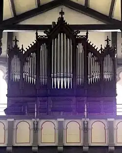 Das Kegelladen-Instrument mit freistehendem Spieltisch, das zentral auf einer Empore aufgebaut ist verfügt über 15 klingende Register, verteilt auf 2 Manuale und Pedal. Das mittelbraun lasierte Gehäuse besteht aus massiver Eiche. Die Spiel- und Registertraktur ist pneumatisch. Die Disposition lautet wie folgt:[3][4]