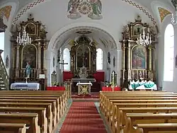 Das Langhaus der Saalkirche wurde 1739–1741 erbaut. Der eingezogene Chor mit Fünfachtelschluss im Osten und die unteren Geschosse des Chorflankenturms auf quadratischem Grundriss an der Nordwand des Chors stammen vom Vorgängerbau aus der 2. Hälfte des 15. Jahrhunderts. Der Chorflankenturm wurde 1766 mit einem Geschoss mit abgeschrägten Ecken aufgestockt, das die Turmuhr und den Glockenstuhl beherbergt, und mit einer Zwiebelhaube bedeckt. Der Innenraum des Langhauses wurde 1912/13 mit einem Tonnengewölbe überspannt, der des Chors mit einem Stichkappengewölbe. Die 1913 angebrachten Fresken stammen von Jakob Huwyler. Der Hochaltar wurde 1884 gebaut. Die Altarretabel der Seitenaltäre hat 1798 Nikolaus Weiß bemalt.