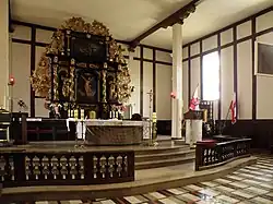 Der Innenraum der Kirche hat eine flache mit Kassetten bemalte Holzdecke und seitliche Emporen.[3] Der reich ausgestattete Altar wurde aus der früheren Kirche übernommen. Die figurenreiche barocke Kanzel von 1701 ist aus dem Achteck geschnitzt[1] und wird von Mose und Johannes dem Täufer getragen[2]. Ein Taufengel von 1704 wird der Werkstatt des Isaak Riga zugeschrieben, und zwei Abendmahlsengel wurden Anfang des 18. Jahrhunderts geschaffen[3].