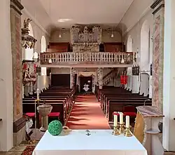 Der Hochaltar im Stil des Rokoko stammt aus der Kirche St. Michael in Würzburg. Er datiert aus dem Jahr 1775. Über dem Tabernakel befindet sich ein großes Kruzifix. Am rechten Seitenaltar sieht man ein Gemälde der Taufe Jesu im Jordan, am linken eines der Muttergottes. An der Kanzel, ebenfalls 1775 im Stil Materno Bossis gefertigt, befindet sich ein Relief der vier Evangelisten. In der Kirche sind auch spätgotische Holzfiguren der Heiligen Vitus und Nikolaus aus der Zeit um 1510 zu sehen.