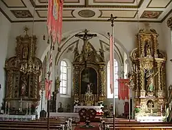 Die Pfarrkirche St. Johannes Baptist ist das Ergebnis verschiedener Bauphasen, die heutige Kirche ist aus einem Neubau um 1700 entstanden. Nordöstlich am Langhaus wurde im 15. Jahrhundert ein Satteldachturm aus unverputzten Tuffquadern errichtet. Im einschiffigen Langhaus sind die Unterseite der Westempore und die Langhausdecke vertäfelt, welche an der Brüstung Tafelbilder mit Szenen aus dem Leben von Johannes dem Täufer darstellen. Sie sind mit dem Jahr 1705 bezeichnet und vermutlich von Georg Wassermann gemalt worden. Der Chor ist eingezogen und dreiseitig geschlossen mit einer Stichkappentonne, mit Stuckverzierung um 1700 und Deckenbildern von Max Vogl (1911).