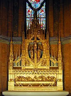 - am Giebel des Altars in Gestalt des auferstandenen und erhöhten Christus.