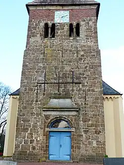 Der romanische Feldsteinturm mit seiner mittelalterlichen Verblendung aus Granitquadern wurde oberhalb der romanischen Schall-Biforien mit neuzeitlichem Backstein erneuert. Darüber erhebt sich ein Zeltdach. Das heutige Westportal aus Sandstein entstand beim Umbau der Kirche 1719 und hat Ähnlichkeit mit den beiden seitlichen Portalen des Kirchenschiffs. Über dem Türsturz aus Kalkstein hat es einen halbrunden Entlastungsbogen, der statt eines Tympanons ein schmuckloses Oberlicht umfasst. Die Gewände sind in einen angedeuteten Vorbau eingebettet, der statt mit einer Attika mit einem geschwungenen „Dach“ aus verputztem Mauerwerk schließt. Unregelmäßige Baufugen zeigen an, dass beim Einbau des Portals auch das umgebende Granitmauerwerk ausgetauscht wurde.