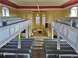 Das Langhaus ist dreiachsig und wird auch von einer flachen Putzdecke mit einer breiten Hohlkehle überspannt. In den drei Gebäudeseiten befinden sich jeweils in der Mitte flachbogige Eingänge, im Süden zugemauert, darüber ein niedriges und seitlich jeweils ein hohes, flachbogiges Fenster. Den Innenraum prägt einen eingeschossige, an drei Seiten umlaufende, breite Holzempore. Diese steht auf toskanischen Säulen und hat Brüstungen, die durch Pfosten und Kreisfelder, dazwischen Rahmenfelder, gegliedert ist. Die Treppenaufgänge sind in den Ecken angeordnet. Die Außenwände des Langhauses mit seinem abgewalmten Satteldach bestehen aus verputztem Brocken- und Quadermauerwerk. Aus unverputztem Sandstein sind die Ecklisenen und an Fenstern und Türen die flachbogigen Rahmen mit Keilsteinen. Am Nordportal befindet sich zusätzlich eine Verdachung mit einem Gesims und links davon mit zwei Schilden das Wappen des Würzburger Hochstiftes mit Krone, Schwert und Krummstab und der Jahreszahl 1787. Über dem Westportal ist das Allianzwappen mit Decke, Helmzier, Helm und Kleinod der ganerblichen Patronatsherren von Lichtenstein und von Heßberg angebracht. Ein geschlossener, spitzbogiger Eingang in der Nordwand und zwei vermauerte Spitzbogenfenster in der Südwand belegen spätmittelalterliches Mauerwerk.[1]
