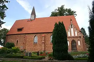 Das Bauwerk wurde im Wesentlichen aus rötlichem Mauerstein auf einem Fundament aus Feldsteinen errichtet. Der Chor ist gerade und nicht eingezogen. An der Chorostwand ist mittig ein großes und spitzbogenförmiges Fenster mit einer abgefasten Laibung. Auf dem Ostgiebel befindet sich ein Blendenkreuz unterhalb dessen zweireihige Blenden und zwei doppelte Deutsche Bänder gemauert wurden. In den mittleren drei der fünf Blenden ist je ein gekuppeltes und spitzbogenförmiges Fenster. Der Giebel wurde beim Wiederaufbau nach dem Vorbild des mittelalterlichen Westgiebels errichtet.