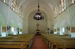 Die Saalkirche ist als steinsichtiger Werksteinbau errichtet. Der Altarraum der Kirche ist nach Westen ausgerichtet, was der üblichen Bauweise widerspricht.