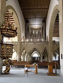 Die Empore enthält weitere Bilder des Jesu-Zyklus der Kirche, beginnend im Herrenchor,[16]. Die Orgel wurde 1992 von der Firma Sandtner aus Dillingen an der Donau gebaut. Hans Jürgen Richter schuf die Disposition. Das Werk enthält 53 Register auf drei Manualen und Pedal. Die Gestaltung übernahm Franz Lichtblau. Die Schleierbretter wurden von Karlheinz Hoffmann aus Lindenholz gefertigt.