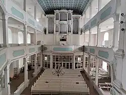 Die Orgel mit 38 Registern, verteilt auf zwei Manuale und ein Pedal, wurde 1853 von Julius Strobel gebaut. Die Register- und Tontraktur ist mechanisch. 2019 wurde die Orgel zum Teil restauriert durch Orgelbau Kutter. Die Disposition lautet wie folgt:[3][4]