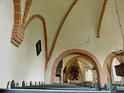 Der Innenraum ist in drei Joche mit unterschiedlichen Dimensionen gegliedert. Zwischen dem West- und dem Mitteljoch steht eine tief herabgezogene doppelte Arkade zur statischen Sicherung des Gurtbogens. Dadurch ist die eigentlich einschiffig angelegte Kirche in gewisser Weise zu einer Hallenkirche geworden. Zur Kirchenausstattung gehört ein barocker Altar, in dessen Zentrum der Sündenfall und die Kreuzigung und im oberen Geschoss die Auferstehung dargestellt sind. Als Bekrönung über einem Sprenggiebel triumphiert Jesus Christus. Auf der Brüstung der barocken Kanzel sind die vier Evangelisten farbig dargestellt. Der Schalldeckel wird von einem Pelikan bekrönt. Das mit einer Majestas Domini bemalte Gewölbe wurde um 1960 restauriert.