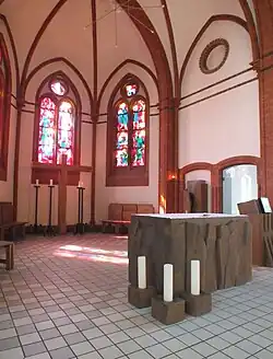 Der frühere Hochaltar im Zentrum des Chorraumes, im Ergebnis der Liturgiereform abgebaut, wurde im Auftrag der Kirchengemeinde durch einen mit dunkel gebeiztem Naturholz gestalteten Altar ersetzt. Er zeigt in groben Umrissen das Volk Gottes. Darüber hinaus bilden nun ein Ambo (aus gleichem Holz wie der Altar gefertigt) sowie ein schlichtes Taufbecken und ein Tabernakel die Ausstattung des Altarraumes. Auch die auf dem Boden aufgestellten Leuchter sind aus groben Hölzern passend geformt.