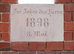 Die Grundsteinlegung fand am 8. Mai 1898 unter Anwesenheit des Fürstbischöflichen Delegaten für Brandenburg und Pommern des Bistums Breslau Propst Karl Neuber aus der Berliner St-Hedwigs-Gemeinde statt. Der Stein kam jedoch nicht in den Baugrund, sondern wurde mit dem Datum versehen neben dem Altarraum sichtbar in den Triumphbogen eingemauert (siehe Bild).[7]