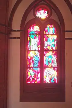 Die provisorischen Flaschenfenster wurden 1958 durch drei bleiverglaste farbige Fenster in moderner Ausführung in der Apsis ersetzt, die Szenen aus dem Leben Jesu und den heiligen Josef darstellen. Sie stammen aus der Werkstatt des Künstlers Gerhard Olbrich.[3][26]