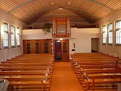 Im Jahr 1977 wurde von der Firma Muhleisen in Strassburg die heutige Orgel der Kirche als Opus 152 erbaut.[12] Die Brüstungsorgel mit mechanischer Traktur verfügt über zehn Register, die sich auf zwei Manuale und Pedal verteilen. Im dreiteiligen Prospekt flankieren zwei Rundtürme ein niedrigeres Pfeifenflachfeld.