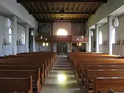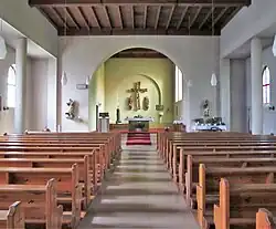 Das Kirchengebäude entstand in einem Stil, der sich an der Neuromanik orientierte, und besitzt fünf Fensterachsen. Der Innenraum der Kirche wird von einem Rundbogen an der Wand des Altarraums dominiert, der den Rahmen für eine Kreuzigungsgruppe bildet. Zentrum dieser Figurengruppe ist ein holzgeschnitzter Corpus Jesu im Stil der Gotik, flankiert von Figuren der schmerzhaften Muttergottes und des Evangelisten Johannes. Beleuchtet wird die Figurengruppe von zwei großen Rundbogenfenstern in der Nordwand des Altarraums. Sehenswert ist auch der alte Tabernakel, der ursprünglich auf dem Altar stand und sich heute auf einer Sandsteinsäule befindet. Nachträglich wurde er mit einer Bronzeumhüllung versehen.[2][3]