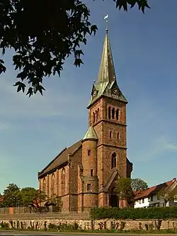 Die einschiffige neugotische Kirche steht auf einer kleinen Anhöhe nahe der Bundesstraße 243 in rund 240 Meter Höhe über dem Meeresspiegel. Der ortsansässige Architekt Peters erstellte den Vorentwurf, den Christoph Hehl revidierte und umsetzte.[6] Ihr an der Nordfassade stehender Turm mit quadratischer Grundform ist weithin sichtbar.