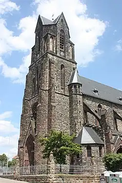 Der Neubau wurde aus dunkelrotem Buntsandstein errichtet, der grob bossiert und mit einem geraden Randschlag versehen ist. Die Bruchsteine bezog man aus Arzweiler im Elsass, die Hausteine aus Mackweiler im Elsass. Die geostete Kirche ist dreischiffig, dreijochig im achsensymmetrischen Langhaus und verfügt über ein leicht ausladendes Querschiff mit eingezogenem, polygonalem Chor. Ein Strebesystem aus Strebepfeilern und Strebebögen zeigt außen die Jocheinteilung des Inneren an. Die Kirchenfassade besteht aus einem neogotischen Fassadenturm mit oktogonalem Glockengeschoss, der ursprünglich in einem hohen Helm auslief. Der Fassadenturm wird von zwei kleinen, polygonalen Kapellen flankiert. Hinter den beiden Kapellen der Front und an den Giebeln der Querschiffe fallen die für den Architekten Rüppel charakteristischen Treppengiebelwände auf.